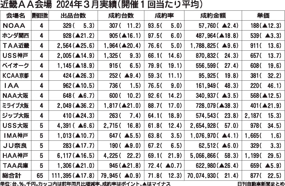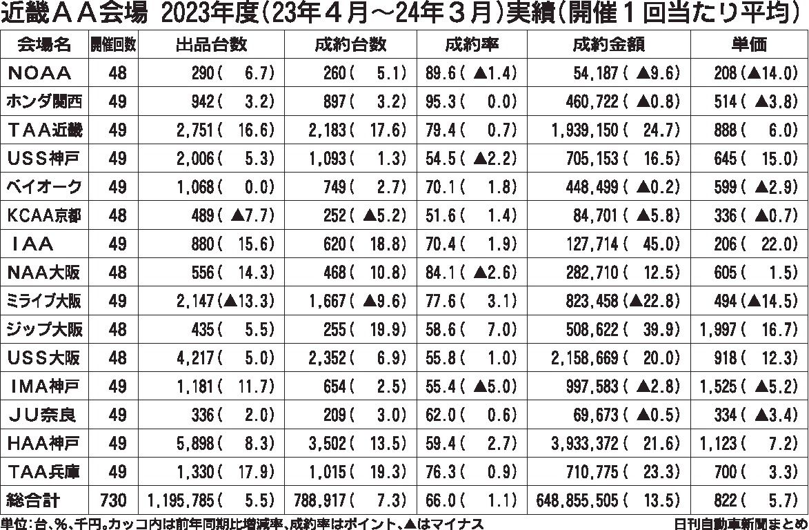 日刊自動車新聞は近畿地区の中古車オークション(AA)15会場の2023年度(4月~24年3月)実績をまとめた。15会場の開催回数の合計は前年度に比べ1回少ない730回。上期までは出品台数が前年同期を上回っていたが、下期からは下回る月も目立...