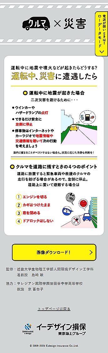 イーデザイン損害保険(桑原茂雄社長、東京都新宿区)は、自動車を運転中に自然災害に遭遇した場合の対応策などをまとめた特設サイト「そのときクルマに乗っていたら?スクショ防災」を開設したと発表した。能登半島地震の発生など大規模な災害が目立ってい...