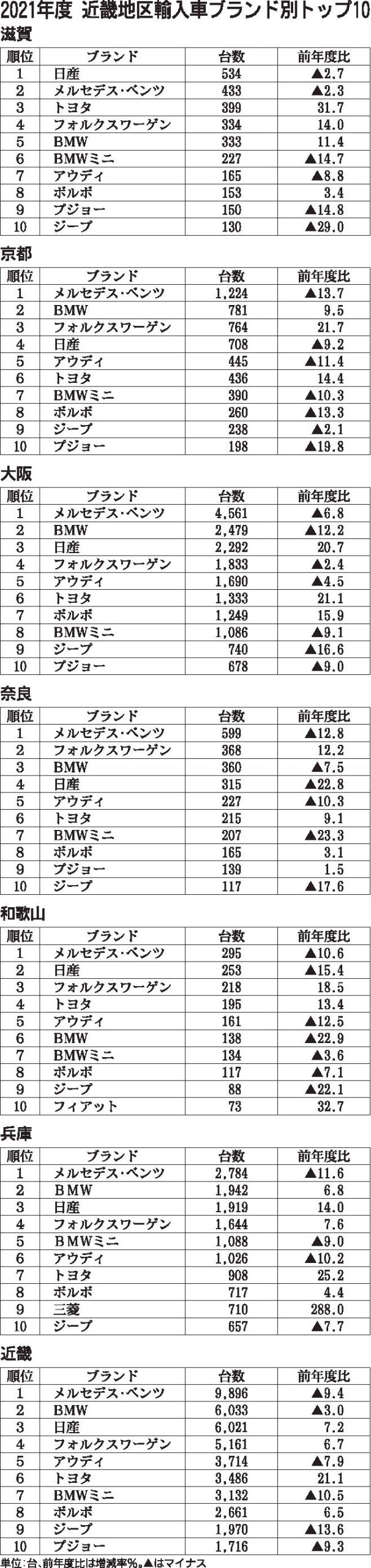 日本自動車輸入組合(JAIA)がまとめた2021年度(4月~22年3月)の近畿地区の輸入車新規登録台数(外国メーカー車と日本メーカー車)によると、メルセデス・ベンツが前年度比9・4%減の9896台で、昨年に続き首位を守った。量販車種が生産...