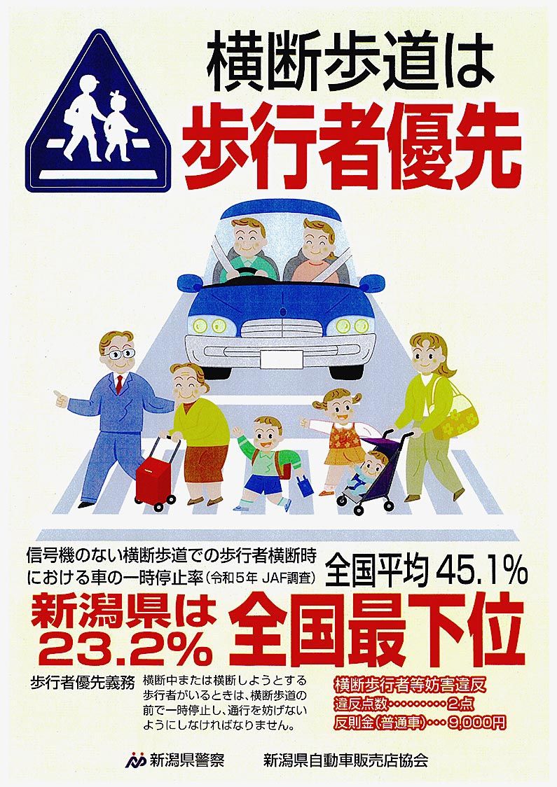 【新潟】日本自動車販売協会連合会新潟県支部・新潟県自動車販売店協会(町田一越支部長・会長)は、自動車販売会社の社会的責任として新潟県警察本部などと協力して、「横断歩道は歩行者優先」の交通ルール順守のため、啓発活動の一環としてポスターおよび...