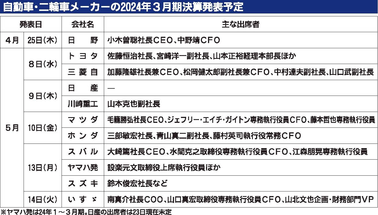 自動車メーカーの決算発表が4月25日から始まる。前期は値上げや円安の効果で7社が過去最高水準の営業利益を確保したもよう。ただ、2025年3月期は人件費の高騰や供給改善に伴う販売奨励金の上昇などが利益を圧迫する可能性が高い。為替の行方は読め...