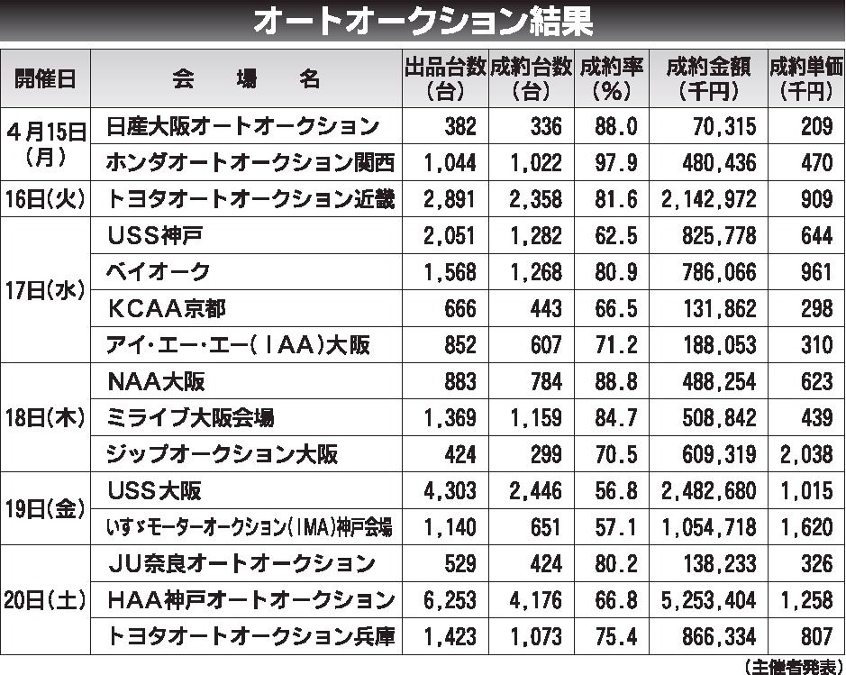 〈オートオークション結果〉近畿地区 2024/4/15~20