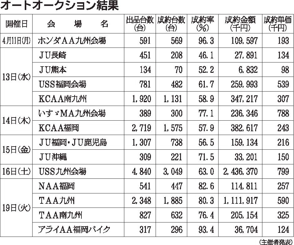 〈オートオークション結果〉九州地区 2022/4/11~19