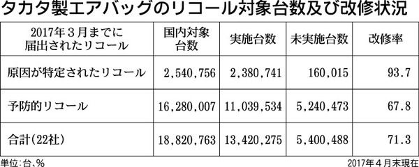 国土交通省は17日、タカタ製エアバッグ用インフレーター(膨張装置)の改修進ちょくをまとめた。4月末時点の改修率は71・3%。予防的リコールの対象車が増えたため、前月末に比べ1・6ポイント下がった。4月以降、追加のリコール(回収・無償修理)...