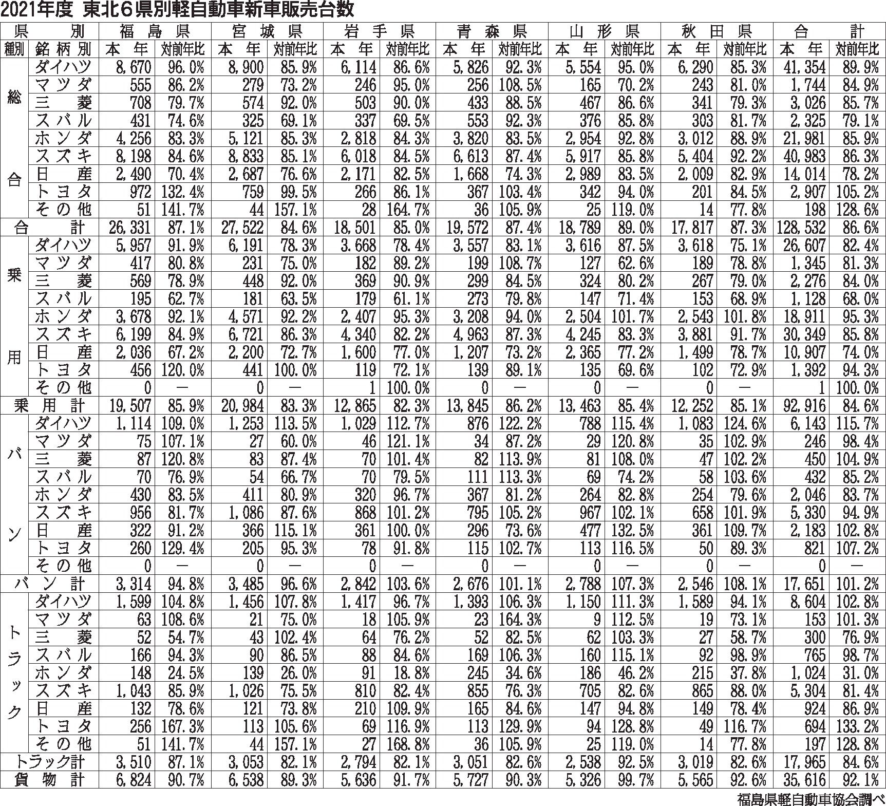 〈2021年度 東北6県別軽自動車新車販売台数〉