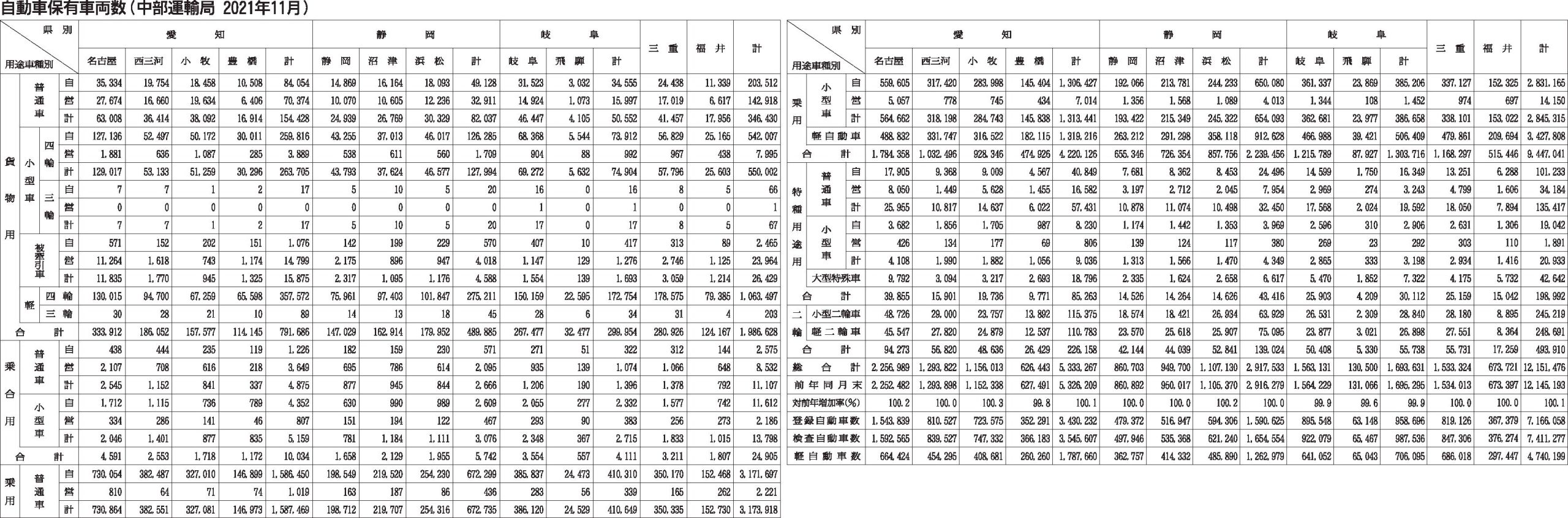 〈自動車保有車両数(中部運輸局 2021年11月)〉