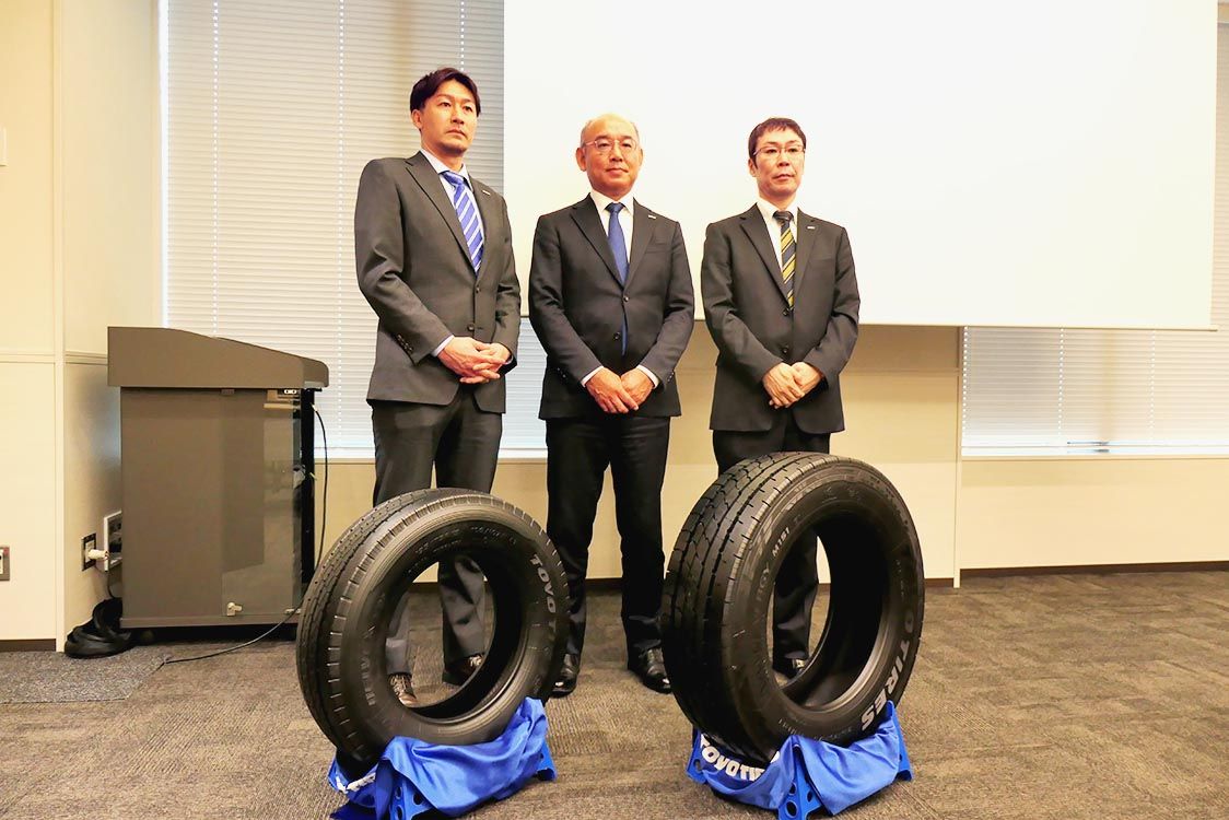 トーヨータイヤは24日、小型トラック用タイヤの2製品を6月に発売すると発表した。小型電気トラック(EVトラック)専用の「ナノエナジーM151EV」は、同社のトラック・バス用で初めて「EV専用非対称パターン」を採用するなどし、駆動性能や環境性能を高めた。小型トラック用の「デルベックスM135」はコンパウンドを見直すなどして従来品に比べて耐摩耗性を32%向上。物流会社の脱炭素化や、人手不足を背景に増加している未経験ドライバーの安全対策に新製品の提供で貢献する考えだ。