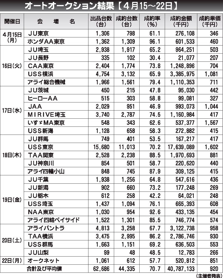 〈オートオークション結果〉首都圏 2024/4/15~22
