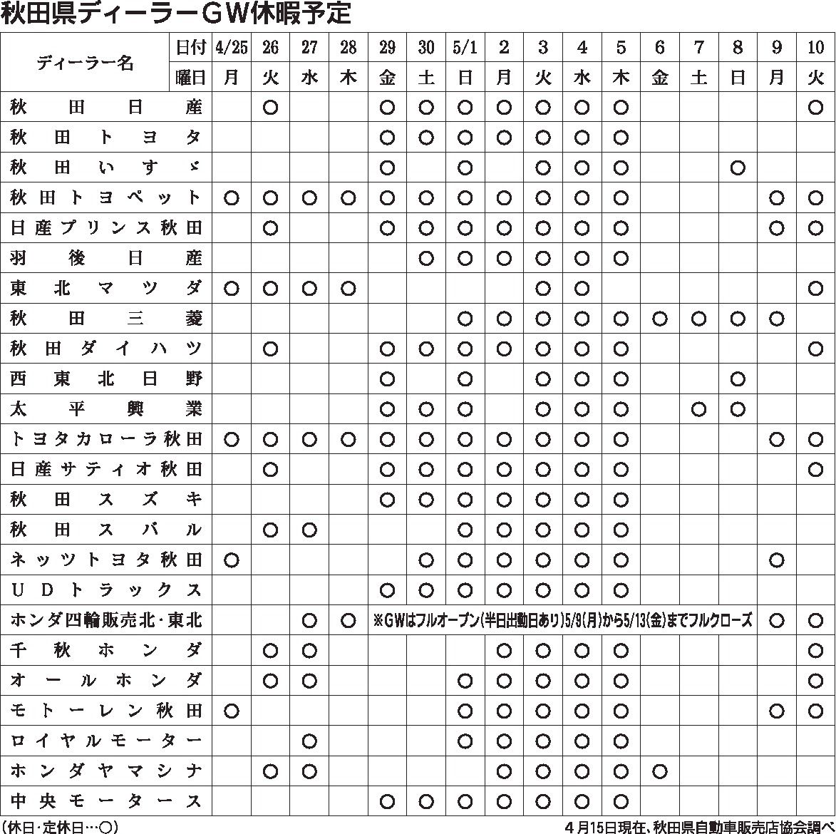 〈2022年 秋田県ディーラーGW休暇予定〉