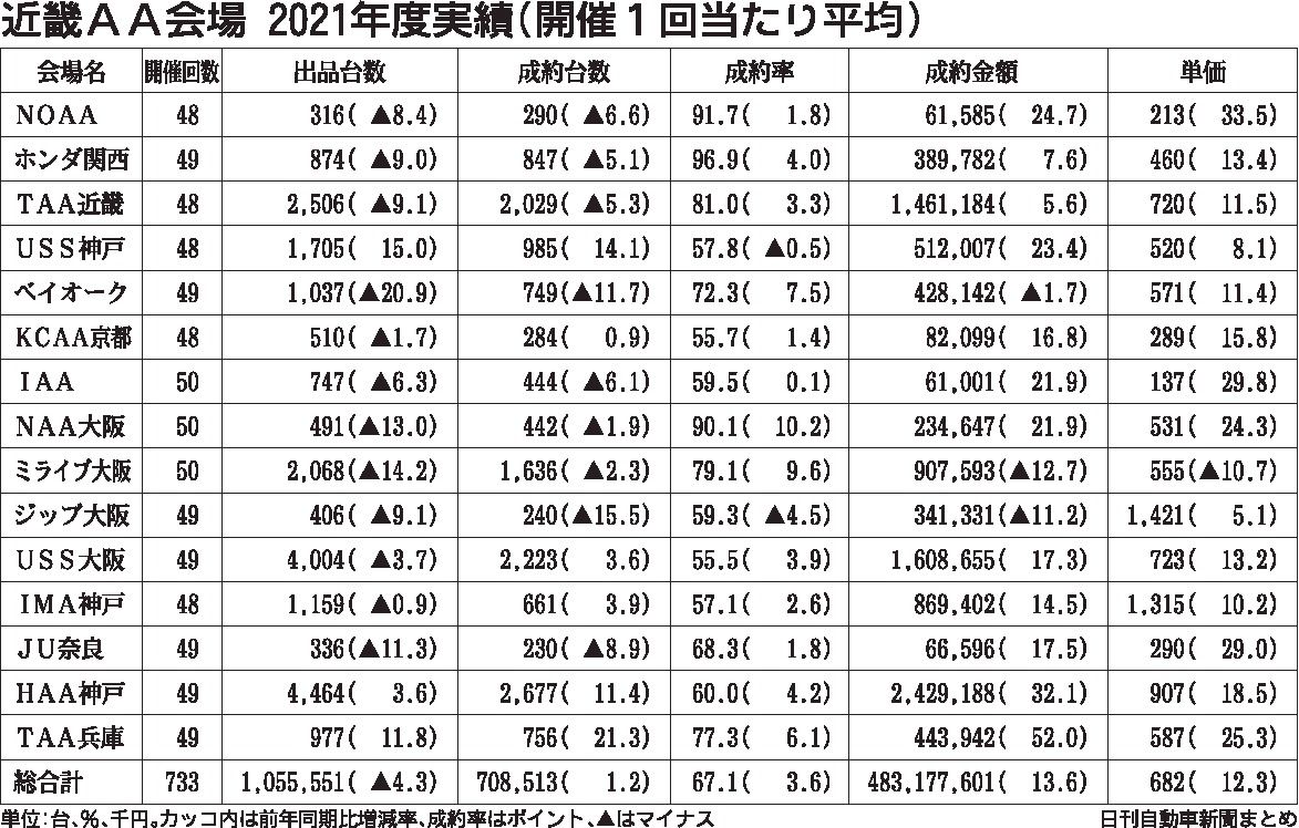 日刊自動車新聞は近畿地区の中古車オークション(AA)15会場の2021年度(4月~22年3月)実績をまとめた。15会場合計の開催回数は前年度に比べて5回少ない733回。出品台数も減少したが、成約台数や成約率は前年度を上回り、成約金額と平均...