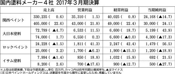国内塗料メーカー4社の2017年3月期連結決算が出そろった。塗料の市況回復が鈍く、円高による為替換算の影響もあって4社のうち、関西ペイントを除く3社が減収となった。収益では、高付加価値製品の販売比率上昇やコスト低減などの効果で4社とも営業...