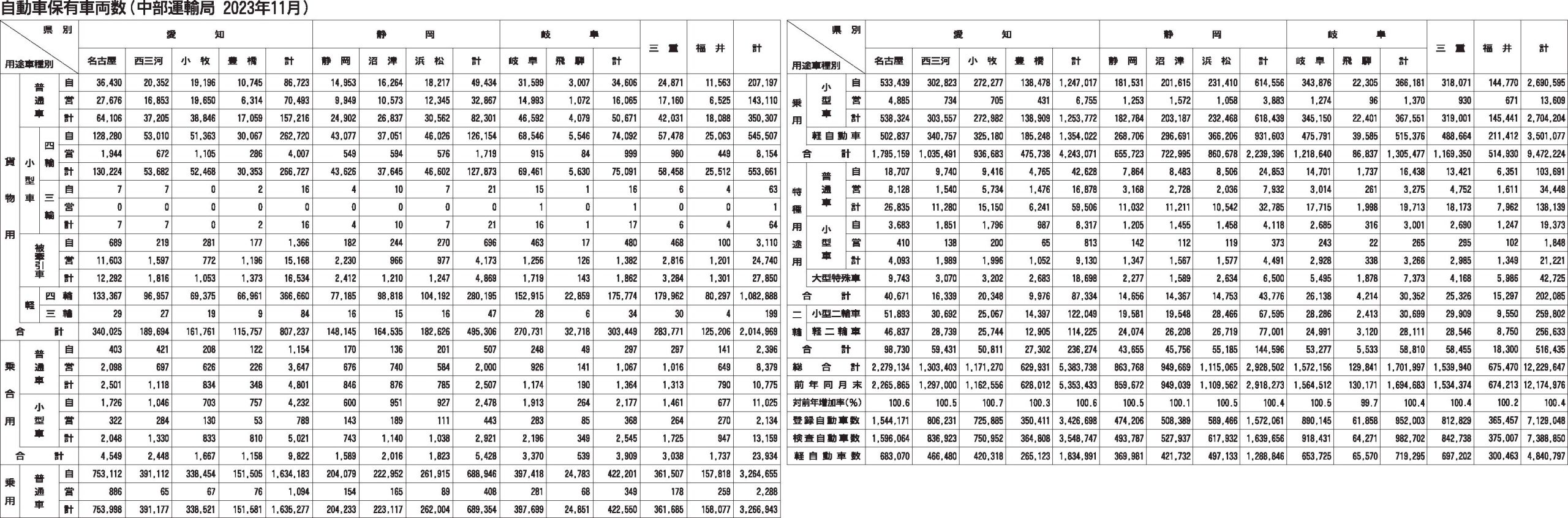 〈自動車保有車両数(中部運輸局 2023年11月)〉