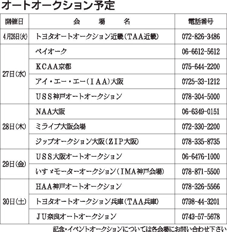 〈オートオークション予定〉近畿地区 2022/4/26~30