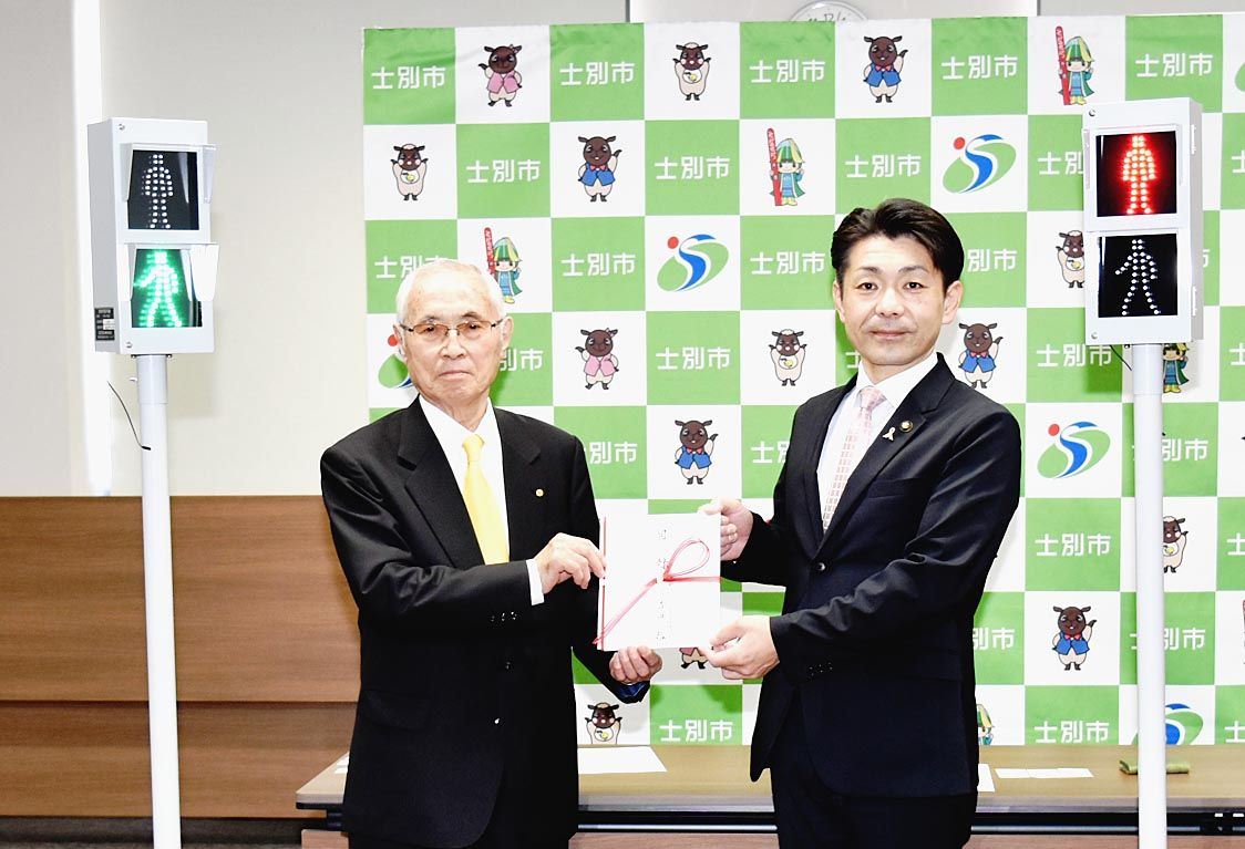 【旭川】旭川地方自家用自動車協会(■(吉の士が土)田裕会長)は25日、士別市と名寄市で新入学児童向け交通安全啓発資材の寄贈式を行った。今月初旬に交通安全黄傘を贈った旭川市を含め、今年は道北地区の3市に寄贈した。 士別市の寄贈式は士別市役所...