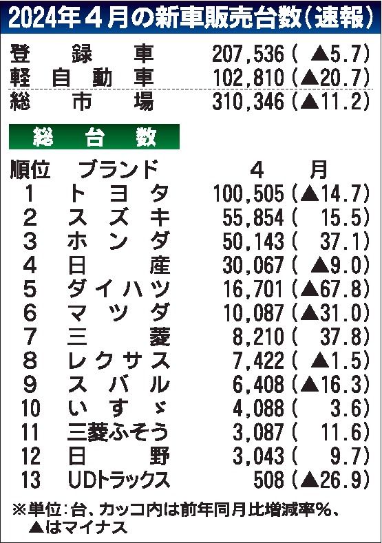 2024年4月の新車販売(登録車と軽自動車の合計)は、4カ月連続の前年割れとなる31万346台(同11.2%減)だった。ダイハツ車の出荷停止などが響き、4月単月としては過去30年間で下から5番目の低水準だった。ただ、下げ幅は前月から9.9...