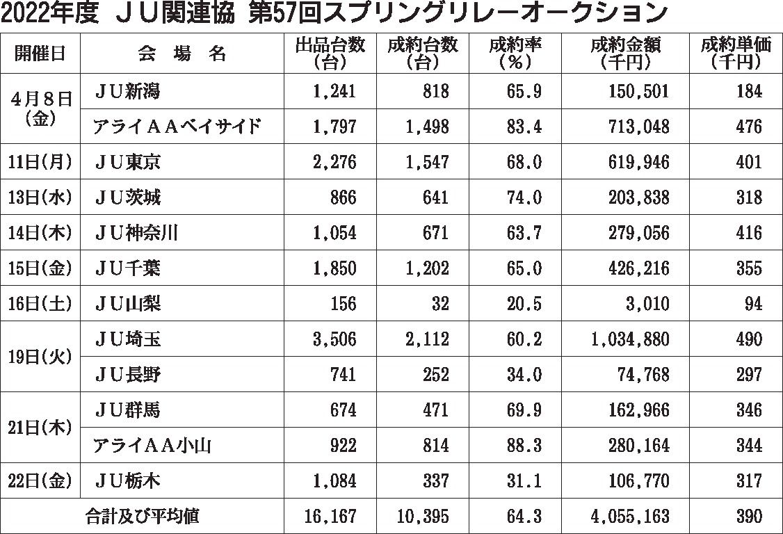 日本中古自動車販売協会連合会関東甲信越連絡協議会(JU関連協、塚田長志理事長)は、「第57回スプリングリレーオークション(AA)」を8~22日の期間で行った。関東甲信越10都県のJU関連協メンバーと賛助会員(荒井商事2会場)を含む12会場...