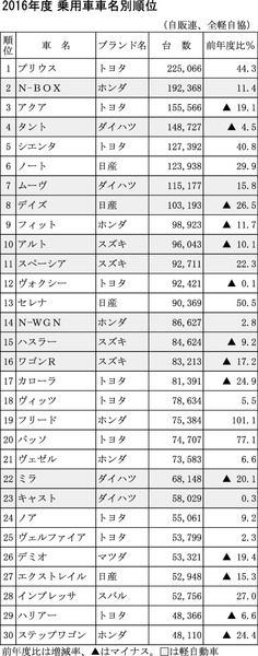 2016年度の乗用車車名別順位は、トヨタ「プリウス」が前年同期比44・3%増、22万5066台で5年ぶりの首位となった。モデルチェンジで商品力が高まり販売を伸ばした。2位はホンダ「N―BOX」。ベストテンのうち軽自動車が5車を占めた。 ま...