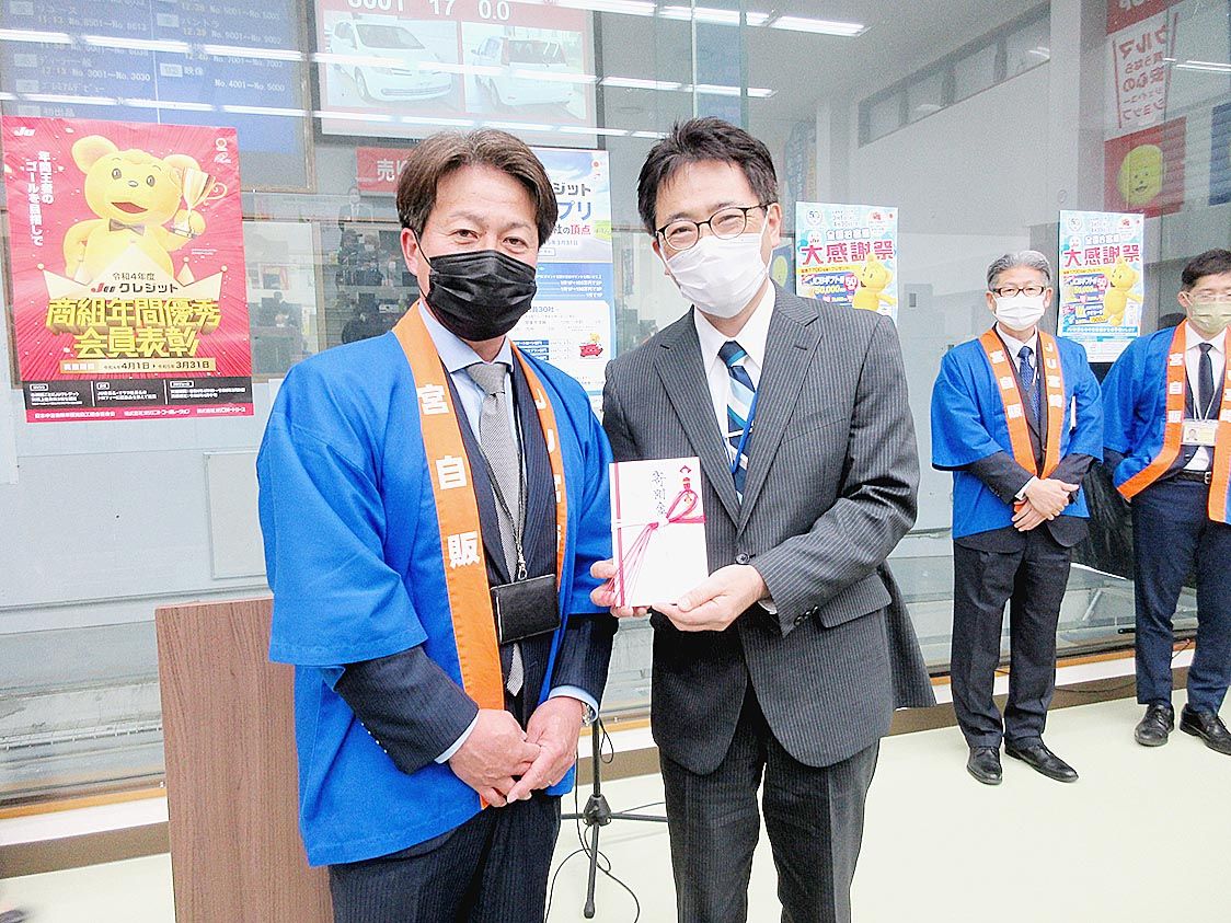 【宮崎】JU宮崎(平山学理事長)は宮崎市の常設会場で、交通遺児支援のための寄付金の贈呈式を行った。JUが取り組むチャリティーキャンペーンで募った募金とJU宮崎の募金を合わせた寄付金12万3403円を自動車事故対策機構宮崎支所(嶋田喜夫支所...