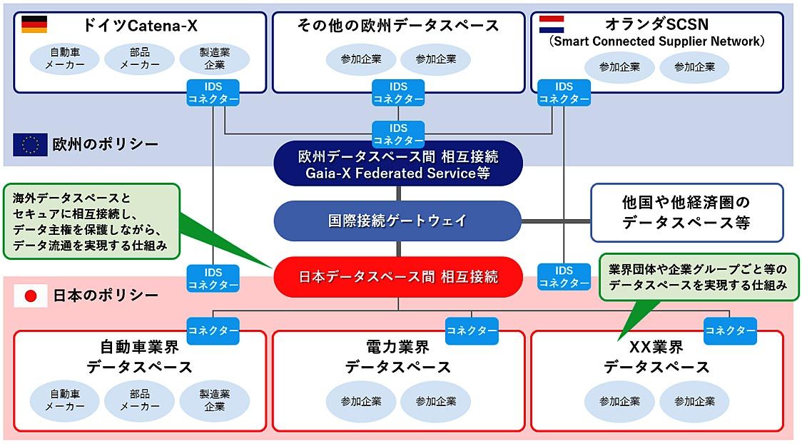 ドイツの自動車メーカーは、ドイツ・フランス両政府によるデータ流通構想「ガイア―X」に沿った技術「IDS」を使って、安全にデータを流通できるカテナ―Xを今夏に運用する予定。ドイツ系の自動車関連企業と取引する日本の企業もデータの流通にカテナ―Xの利用を求められることから、これに対応する日系企業向けデータ流通プラットフォームを開発する。欧州企業のデータ空間に相互接続が可能で、日本のポリシーで安全にデータを管理できる仕組みを構築する。