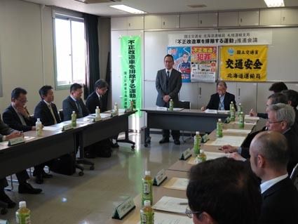 札幌運輸支局は25日、6月の「不正改造車排除強化月間」に向けてその推進会議を同支局会議室で開いた。札幌地方自動車整備振興会など自動車関係団体の担当者が出席し、違法改造車の排除を申し合わせた。 会議に整備振興会のほか、新車・中古車販売、車体...