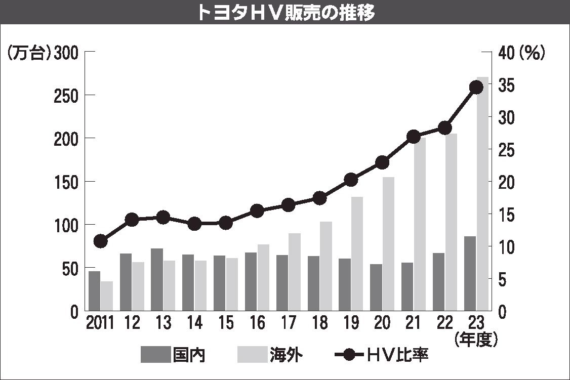 トヨタ自動車の好業績を支えているのがハイブリッド車(HV)だ。2024年3月期のHV(マイルドHV除く)販売は、前期から約80万台増えて約355万7千台となり、新車の3台に1台以上をHVが占めた。「ストロングHV」と呼ばれるトヨタのHVは...