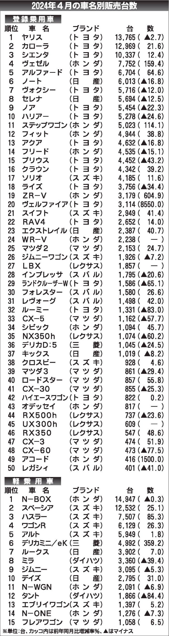 2024年4月の新車販売ランキング、首位「N─BOX」は9カ月連続 ヤリスが2位浮上