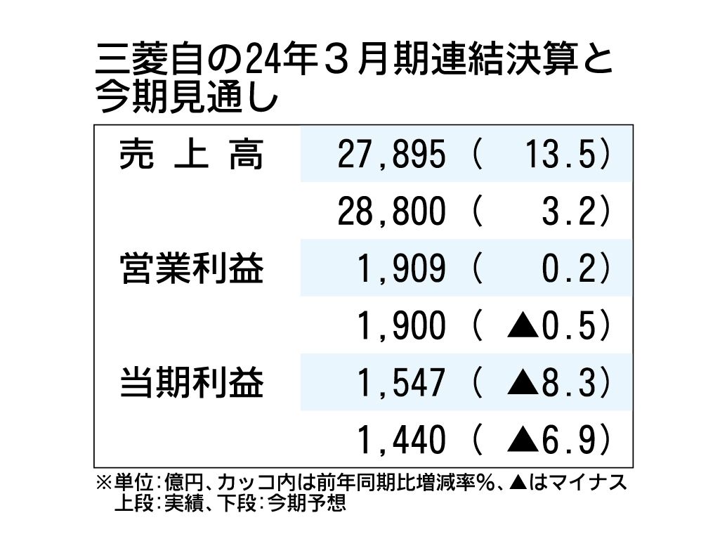 三菱自動車の2024年3月期決算は、売上高が前年度比13.5%増の2兆7895億円、営業利益が同0.2%増の1909億円となり、ともに過去最高となった。ASEAN(東南アジア諸国連合)の一部で市場が低迷したが、円安の影響や商品ミックスの改善などで増益となった。25年3月期見通しは、売上高は同3.2%増の2兆8800億円と過去最高を計画するが、営業利益は同0.5%減の1900億円と減益を見込む。