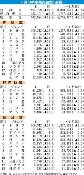 日本自動車販売協会連合会(自販連、天野洋一会長)と全国軽自動車協会連合会(全軽自協、村田浩平会長)が1日発表した11月の新車販売は、前年同月比18・2%減の36万8884台と4カ月連続で前年実績を下回った。登録車は同27・3%と石油ショッ...