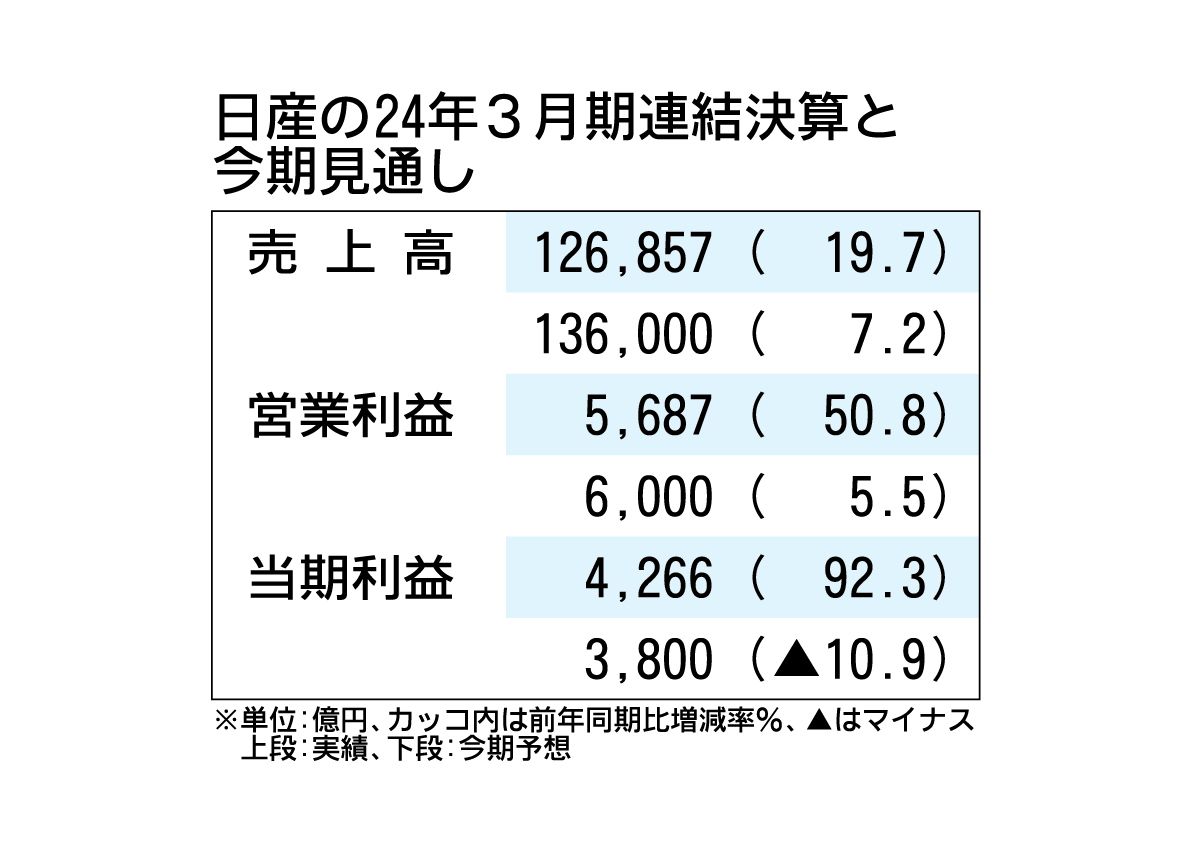 日産自動車は5月9日、2025年3月期の業績見通しを発表した。売上高は13兆6千億円(前年度比7.2%増)、営業利益は6千億円(同5.5%増)、当期純利益は3800億円(同10.9%減)を見込む。売上高は過去最高となる。インフレ費用や販売費用、設備投資の拡大などが利益を押し下げるものの、販売台数の回復に加え、原材料高の一服などで営業利益を上積みする。