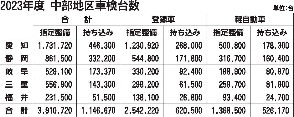 中部地区の2023年度(23年4月~24年3月)の継続検査(車検)台数(登録車+軽自動車)は、前年度比1.9%減の505万7390台となった。年度としては4年振りのマイナスで、登録車(二輪車を除く)が同3.3%減の316万2720台と減少...