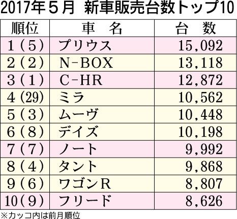 5月の車名別順位(登録車、軽自動車合計)は、トヨタ「プリウス」が3カ月ぶりに首位を奪還した。2月に発売した新型「プリウスPHV」が台数の底上げに貢献した。2位にはホンダ「N―BOX」、3位にはトヨタ「C―HR」が続いた。ダイハツ「ミラ」は...