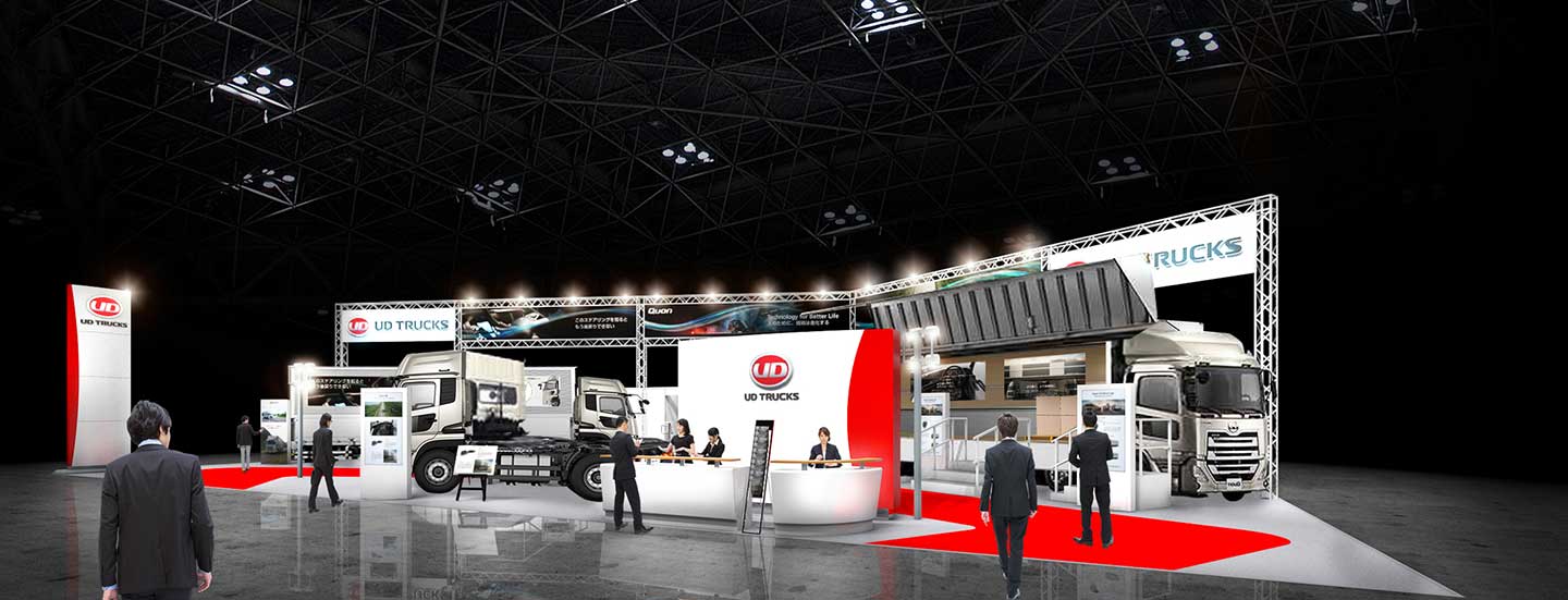 この他会場では、クラス最大級の積載量を実現した大型トラック「クオン」8リットルエンジン搭載車(ショートキャブ)などを展示する。