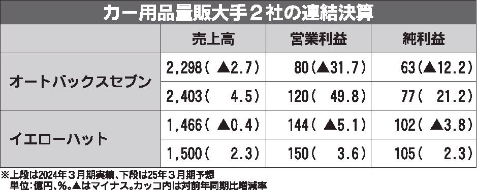 カー用品量販大手2社の2024年3月期の連結決算は、そろって減収減益となった。オートバックスセブンは7期ぶり、イエローハットでは16期ぶりに、売上高と純利益が前期実績を下回った。暖冬の影響により、冬季用品の売れ行きが低調だったことが足かせ...