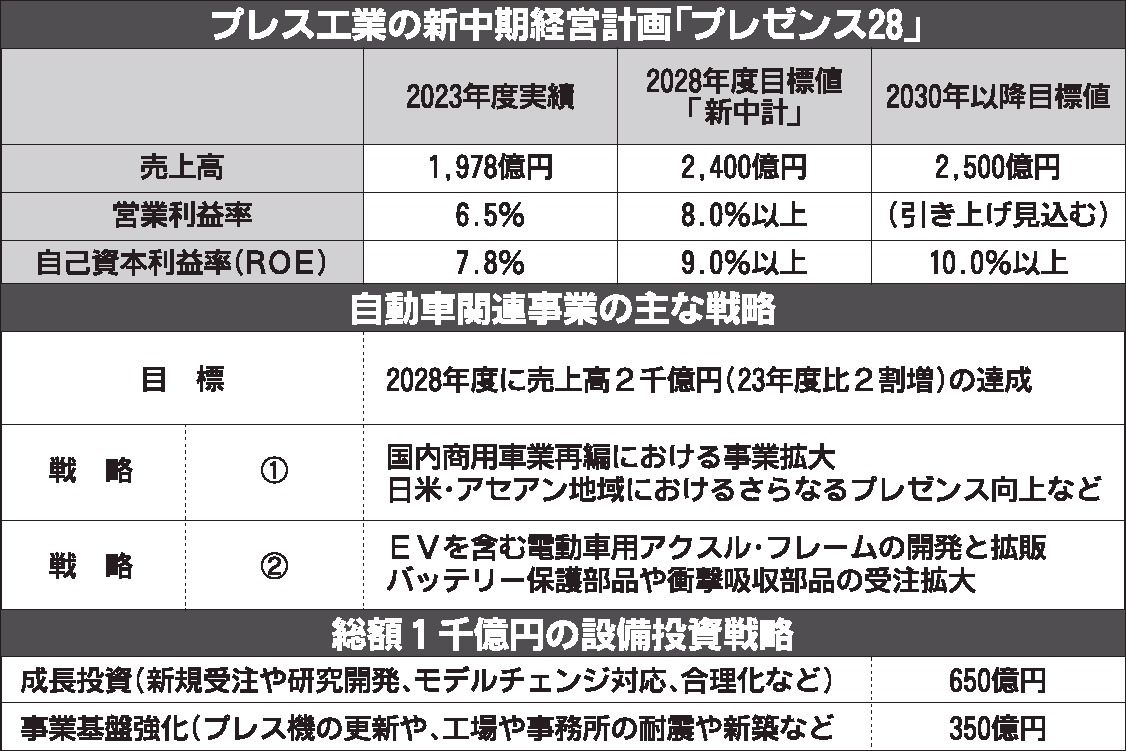 プレス工業が新中計 2028年度に売上高2割増の2400億円 EV関連で120億円稼ぐ