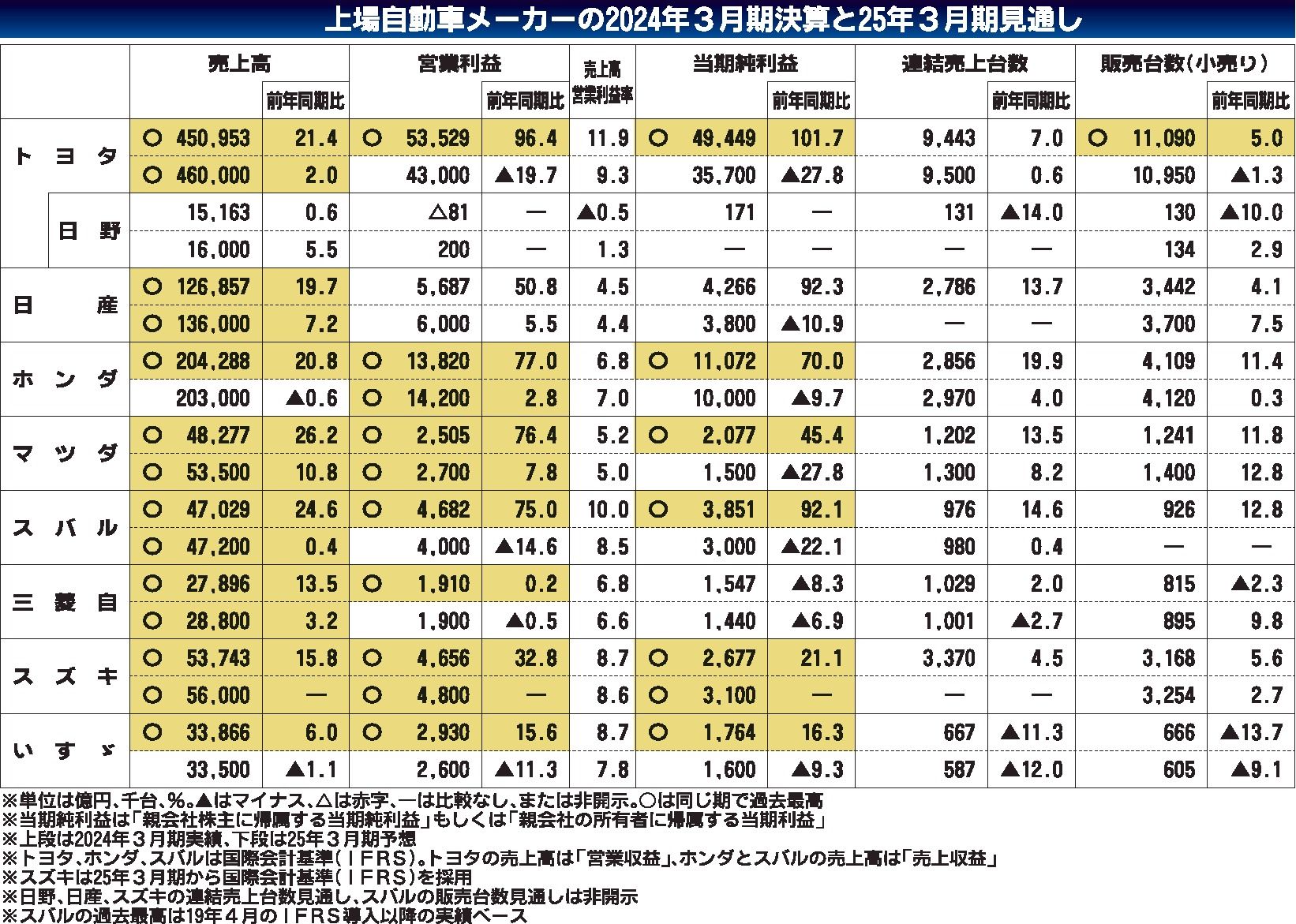 上場自動車メーカーの2024年3月期決算は9社中、7社が過去最高の営業利益を記録した。記録的な円安や生産制約の解消による増収分、さらに値上げ効果が収益を押し上げた。売上高は日野を除く8社が過去最高だ。一方、25年3月期は4社が営業減益を見...