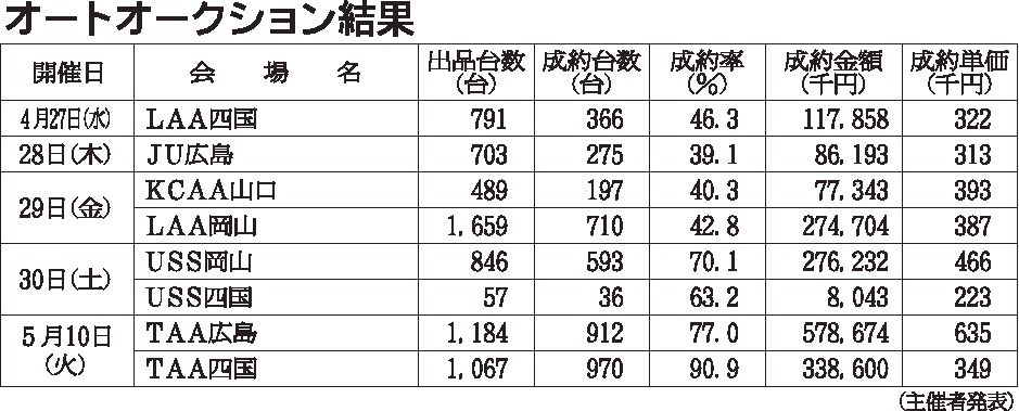 〈オートオークション結果〉中四国地区 2022/4/27~5/10