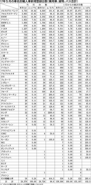 5月の車名別輸入車新規登録台数は、全体が前年同月比1・4%減の2万4378台となった。首位はメルセデス・ベンツで、同1・8%増の4735台。シェアも19・4%で20%の大台に迫った。3位のBMWも同4・0%増、3641台と好調だった。 こ...