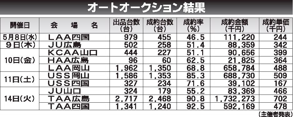 〈オートオークション結果〉中・四国地区 2024/5/8~14
