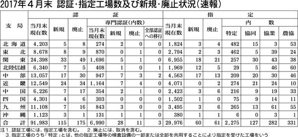 国土交通省は2017年4月末時点の認証・指定工場数および新規・廃止状況をまとめた。認証工場は前月比61件減の9万1983工場となった。一方、指定工場数は2件増の2万9976工場となり、10カ月連続で増加した。専門認証工場数も14件増の69...