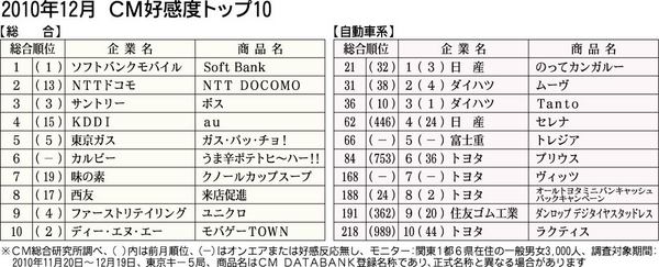 CM総合研究所(関根建男代表)がまとめた2010年12月のCM好感度ランキングによると、10年度のナンバー1ブランドとなったソフトバンクモバイル「ソフトバンク」が引き続き総合1位を獲得した。自動車業類のトップは日産自動車の「のってカンガル...