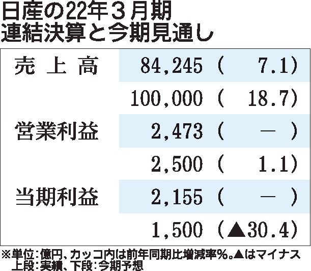 22年3月期の業績は、売上高が前期比7.1%増の8兆4245億円と、18年3月期以来4年ぶりに増加した。営業利益は2473億円(前期は1506億円の赤字)となった。事業構造改革「日産ネクスト」の推進により販売の質的向上を図ったことで収益増につながった。会見で内田誠社長は「厳しい環境下で結果を残せたのは、社内でしっかりとした事業基盤が構築されつつあるからだ。今年度も手綱を緩めることなく事業基盤をさらに強固にしていく」と話した。
