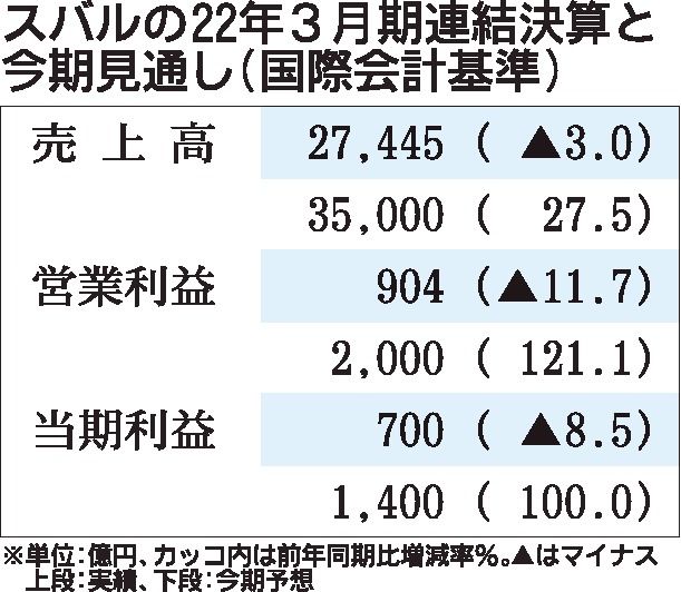 スバルが12日に発表した2022年3月期連結決算(国際会計基準、IFRS)は、売上収益が前年同期比3.0%減の2兆7445億円、営業利益が同11.7%減の904億円となり減収減益だった。半導体不足や東南アジアでの新型コロナウイルス感染拡大に伴う部品供給制約などの影響により、世界生産台数は同10.3%減の72万7千台、連結販売台数は同14.7%減の73万4千台と落ち込んだ。23年3月期の連結決算は販売台数の増加や為替差益の効果を織り込み、売上収益は3兆5千億円、営業利益は2千億円と増収増益を見込む。