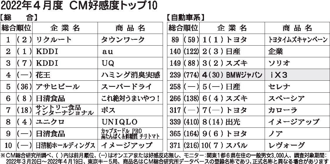CM総合研究所(関根心太郎代表、東京都千代田区)は、2022年4月度のCM好感度ランキングを公表した。総合ランキングではリクルートの求人媒体「タウンワーク」がトップに浮上した。自動車業類は14カ月連続でトップテン入りを逃した。