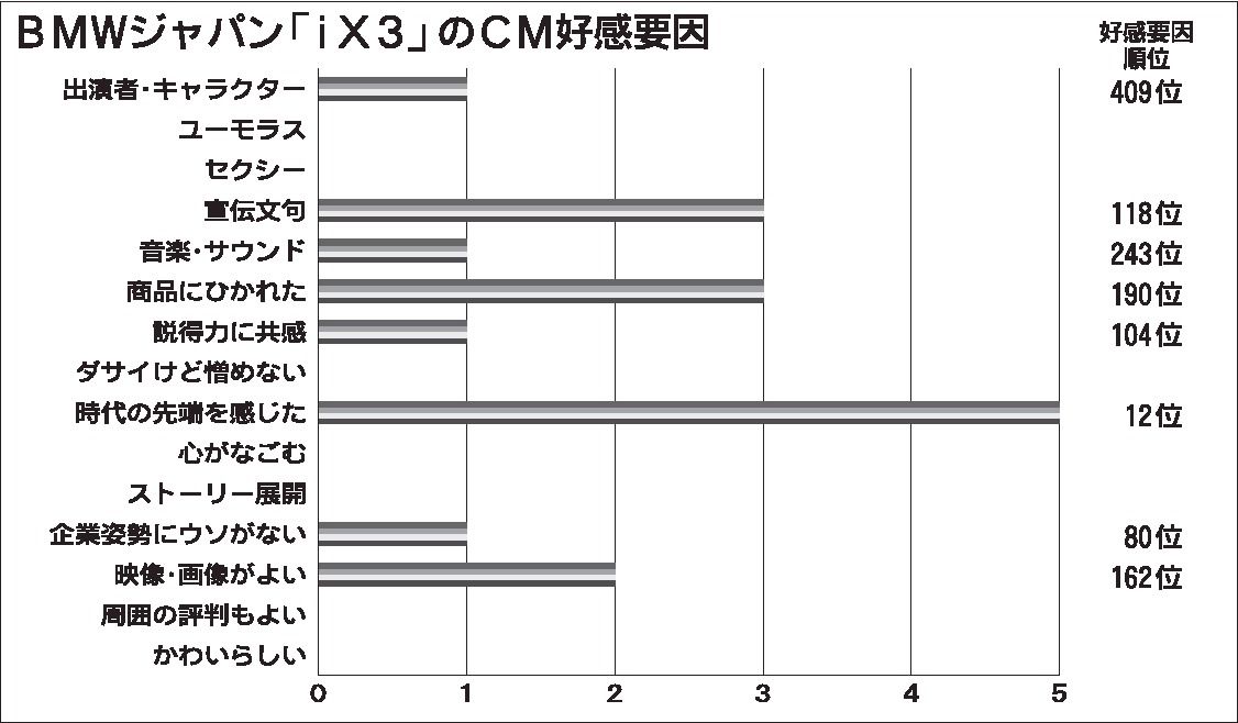 CM総研はこれらの中からiX3に注目した。「電気のチカラで、駆けぬける歓びを。」をコピーに、充電を終えて街中や郊外をドライブする人々のワンシーンをつなぐCMで、30歳代男性などから得票。CM好感要因の「時代の先端を感じた」で好スコアをマークした。