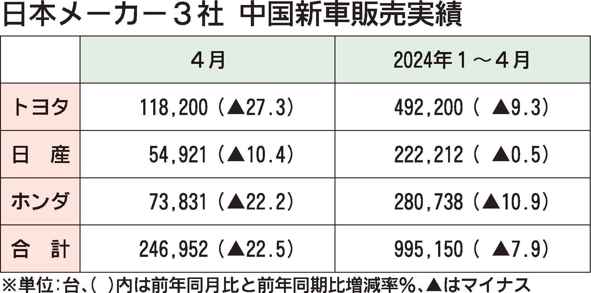 日本メーカー3社の4月の中国新車販売は、前年同月比22.5%減の24万6952台となり、3カ月連続で前年実績を下回った。景気悪化で電気自動車(EV)など「新エネルギー車(NEV)」の値下げが広がっており、日本勢も苦戦を強いられている。 ト...