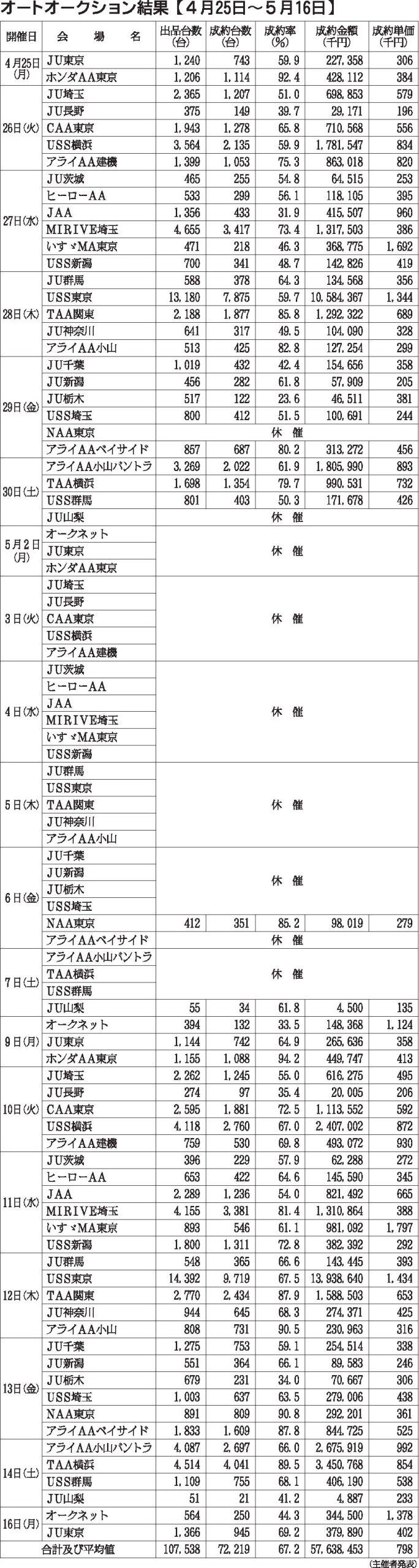 〈オートオークション結果〉首都圏 2022/4/25~5/16