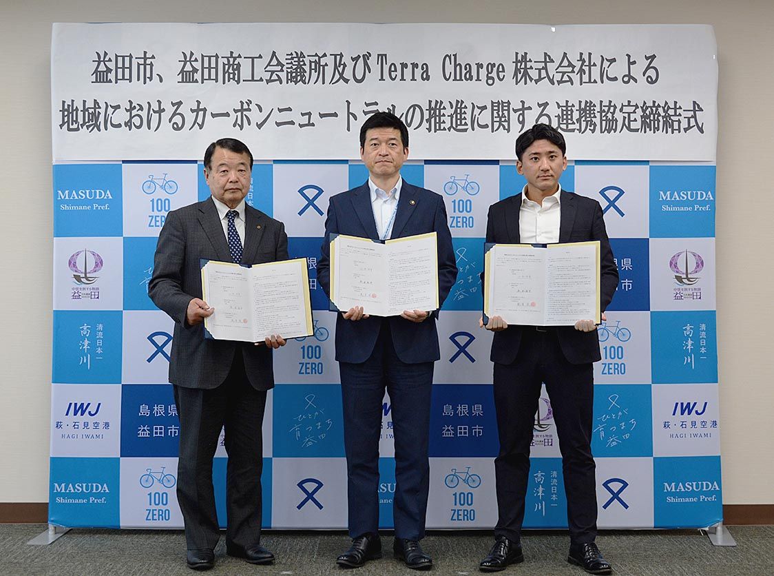【松江】電気自動車(EV)充電インフラ事業を展開するテラチャージ(徳重徹社長)は、益田市および益田商工会議所と3者で「地域におけるカーボンニュートラルの推進に関する連携協定」を締結した。同社が商工会を含む「官民連携」を推進できる3者との連...