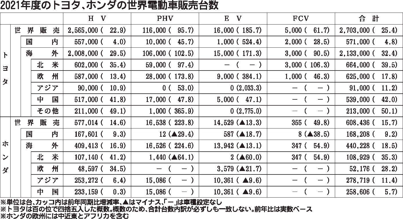 〈2021年度のトヨタ、ホンダの世界電動車販売台数〉