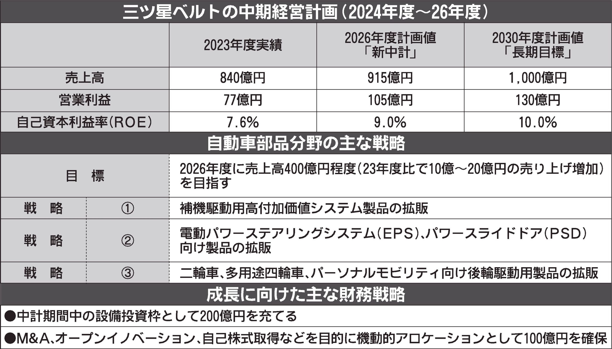 三ツ星ベルトは、新たな中期経営計画をまとめた。最終2026年度に売上高915億円(23年度実績比で約9%増)、営業利益105億円(同約36%増)などを目指す。期中には200億円の設備投資を見込む。自動車部品では、最終年度に電動化対応製品の...