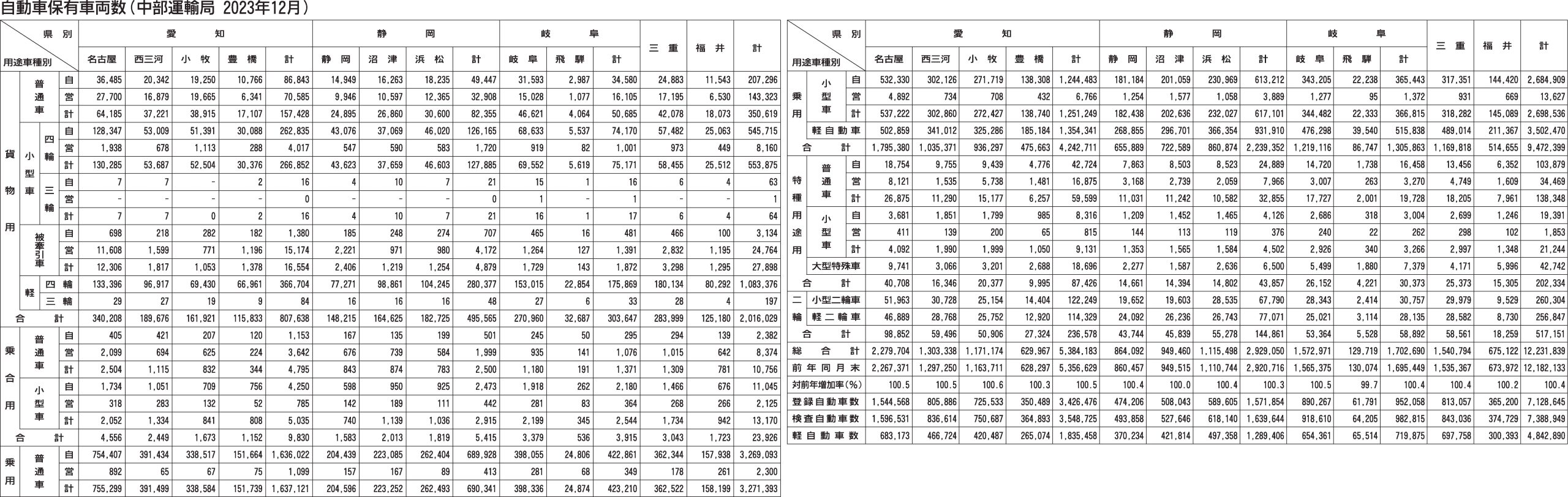 〈自動車保有車両数(中部運輸局 2023年12月)〉